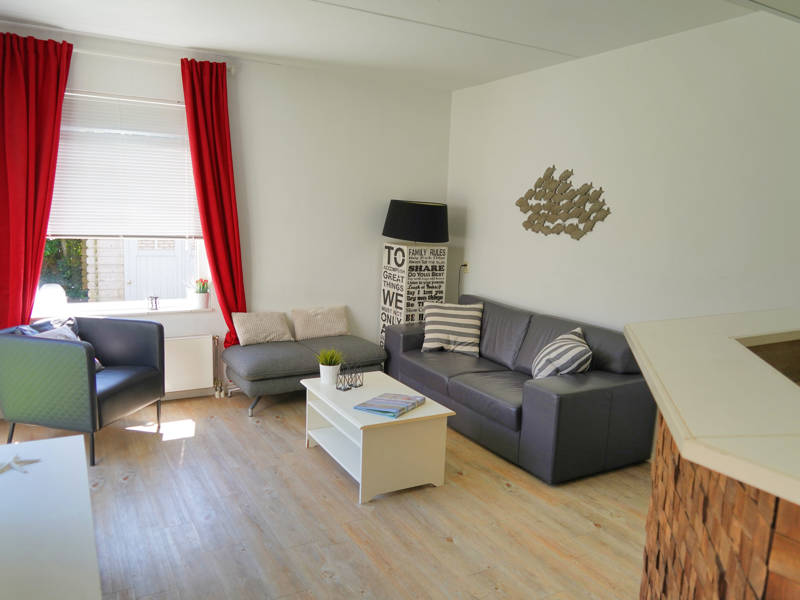 Bij binnenkomst in de woning kom je in de hal met toegang tot de badkamer en de trap naar boven. De woonkamer is licht en sfeervol ingericht, met een comfortabele zithoek, tv en een barretje met wasbak, koelkast en vaatwasser. De 3-pits inductiekookplaat bevindt zich in een aparte ruimte, zodat kookluchtjes niet in de woonkamer blijven hangen.