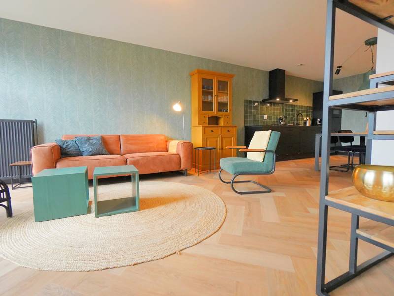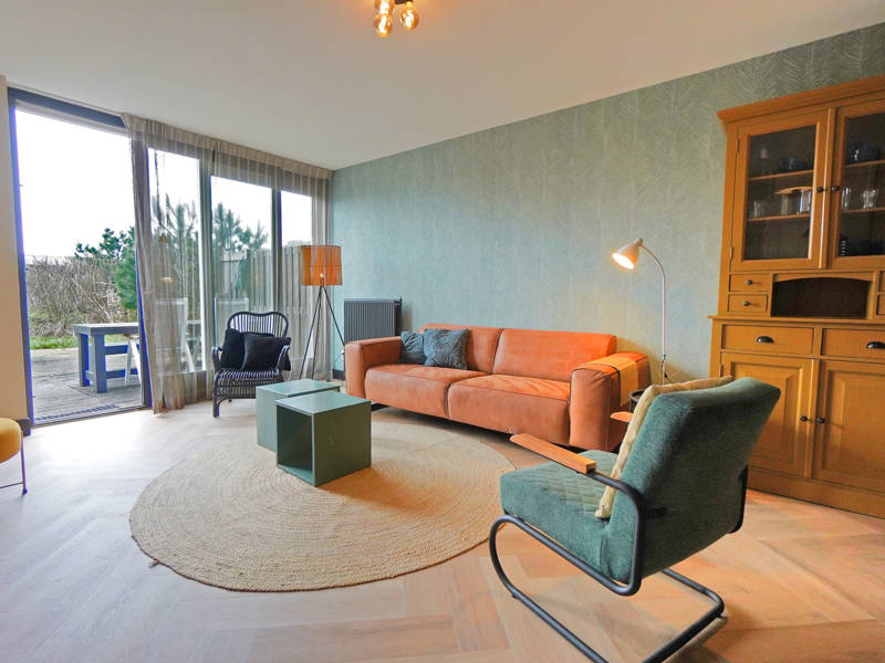 De woning van circa 60 m2 beschikt over een ruime woonkamer met open keuken, eettafel voor 4 personen en een ruime zithoek met bankstel en comfortabele sofa's. Vanuit de woonkamer bereik je via een schuifdeur ook de zonnige tuin.