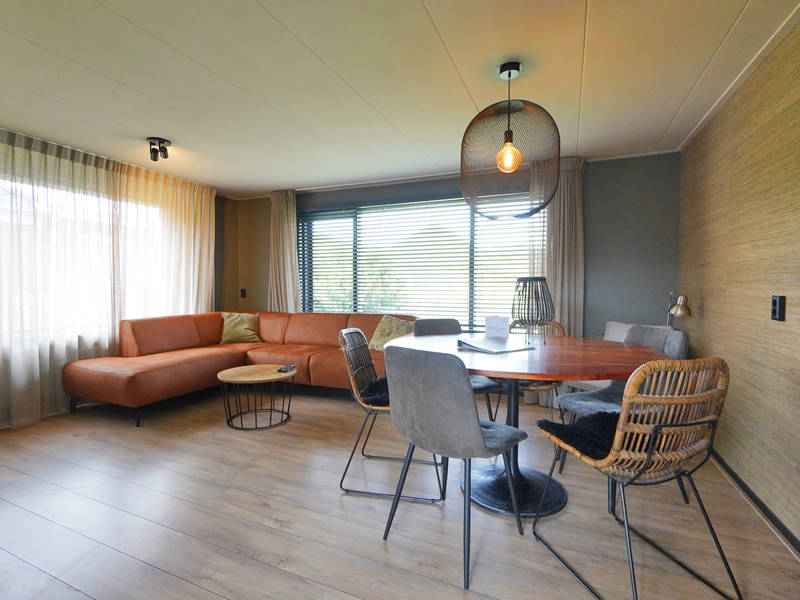 De woning is gelijkvloers en beschikt over een gezellige woonkamer met eethoek en zithoek. De open keuken is voorzien van een grote koelkast en voldoende kastruimte – ideaal voor wie graag zelf kookt tijdens de vakantie.