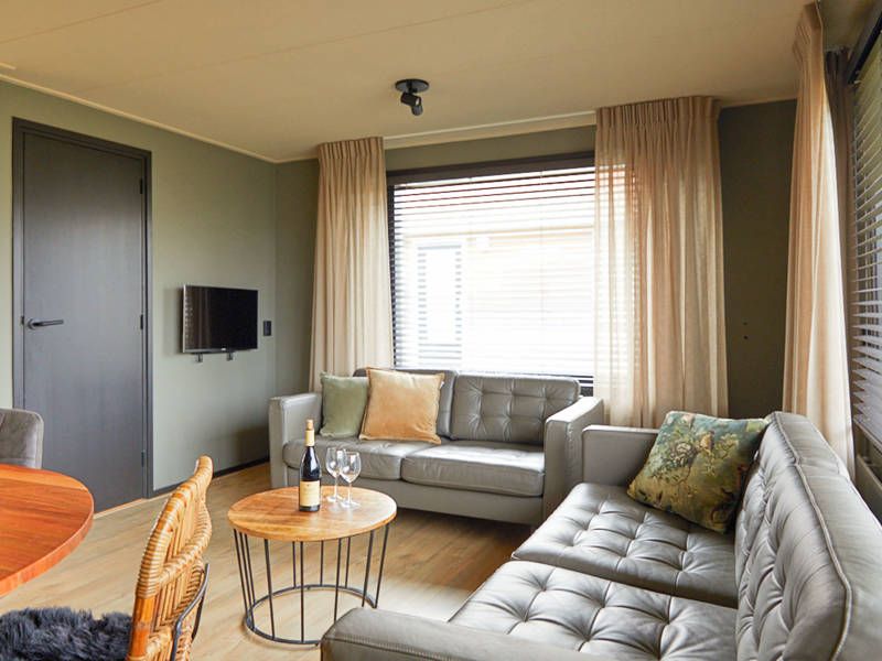 De woning is gelijkvloers en beschikt over een gezellige woonkamer met eethoek en zithoek. De open keuken is voorzien van een grote koelkast en voldoende kastruimte – ideaal voor wie graag zelf kookt tijdens de vakantie.