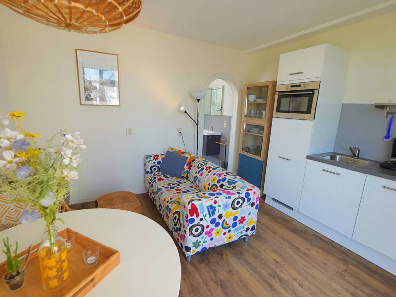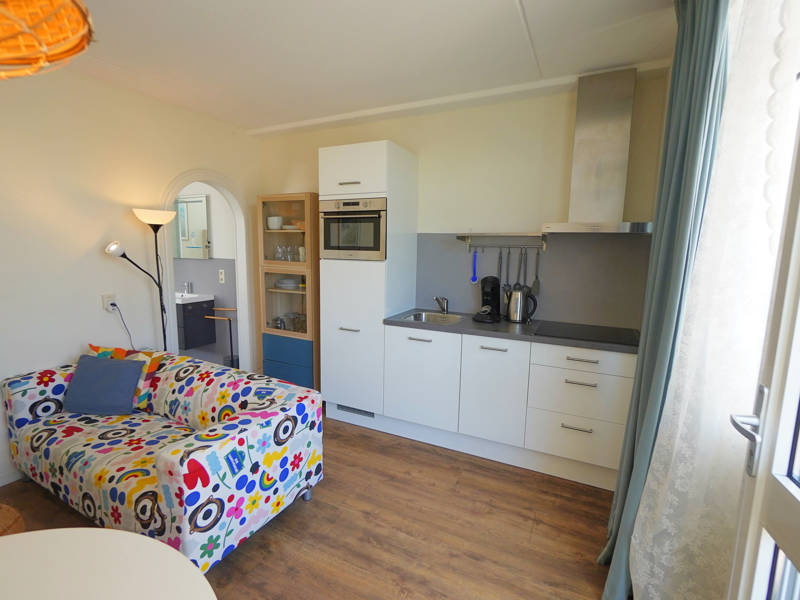 De studio is compact, maar slim ingedeeld. De aparte slaapkamer beschikt over een ruim tweepersoonsbed (boxspring) en is voorzien van een badmeubel en douche. Alles op één verdieping en overzichtelijk – ideaal voor een onbezorgde vakantie.