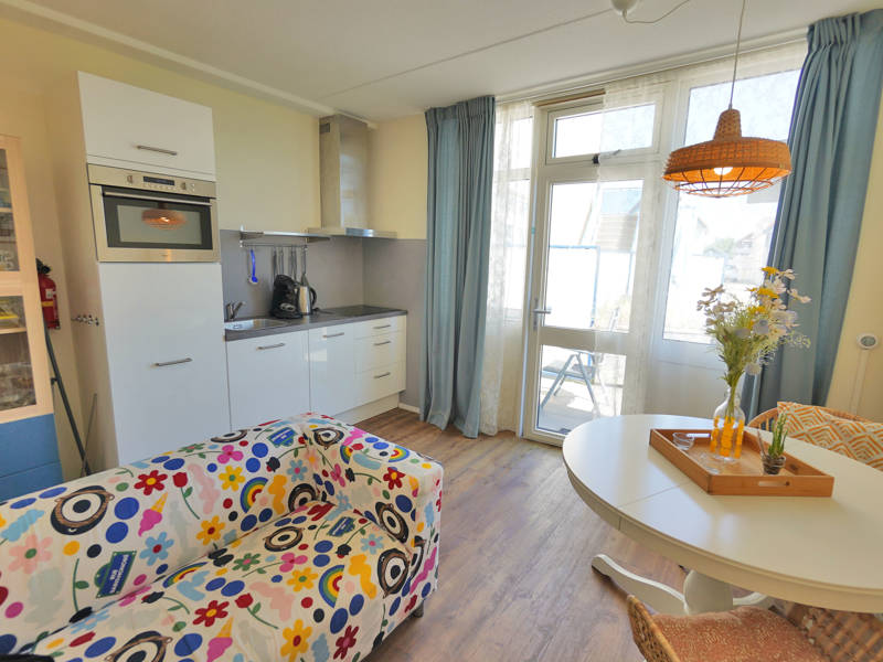 Je komt binnen in de lichte woonkamer met comfortabele bank en ronde eettafel. De open keuken is modern en goed uitgerust met een combi-oven, vaatwasser, koelkast met vriesvak, waterkoker en Senseo-apparaat. Alles wat je nodig hebt voor een ontspannen verblijf is aanwezig.
